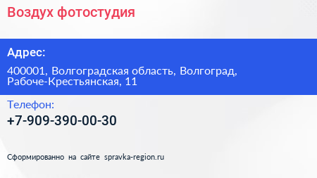 Воздух, фотостудия по адресу 400001, Волгоградская область, Волгоград, Рабоче-Крестьянская, 11 в дальнейшем Организация, размещена в следующих категориях: