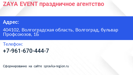ZAYA EVENT, праздничное агентство по адресу 404102, Волгоградская область, Волгоград, бульвар Профсоюзов, 1Б в дальнейшем Организация, размещена в следующих категориях: