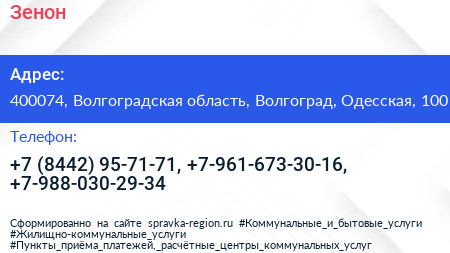 Зенон по адресу 400074, Волгоградская область, Волгоград, Одесская, 100 в дальнейшем Организация, размещена в следующих категориях: