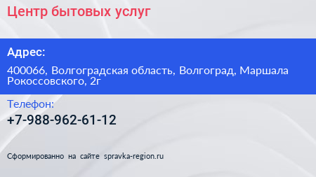 Центр бытовых услуг по адресу 400066, Волгоградская область, Волгоград, Маршала Рокоссовского, 2г в дальнейшем Организация, размещена в следующих категориях:
