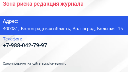 Зона риска, редакция журнала по адресу 400081, Волгоградская область, Волгоград, Большая, 15 в дальнейшем Организация, размещена в следующих категориях: