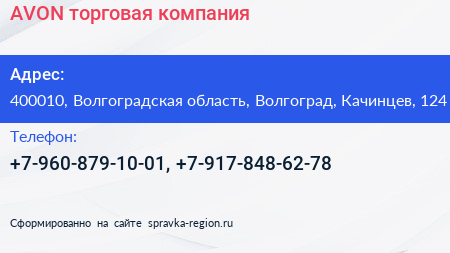AVON, торговая компания по адресу 400010, Волгоградская область, Волгоград, Качинцев, 124 в дальнейшем Организация, размещена в следующих категориях: