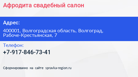 Афродита, свадебный салон по адресу 400001, Волгоградская область, Волгоград, Рабоче-Крестьянская, 7 в дальнейшем Организация, размещена в следующих категориях: