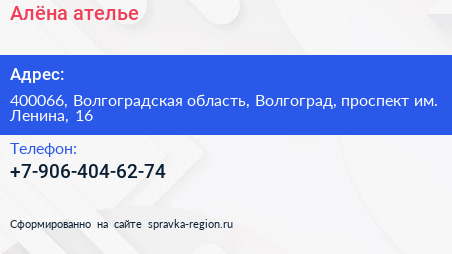 Алёна, ателье по адресу 400066, Волгоградская область, Волгоград, проспект им. Ленина, 16 в дальнейшем Организация, размещена в следующих категориях: