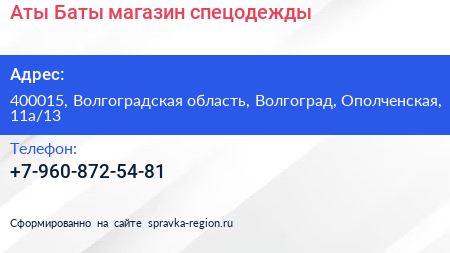 Аты Баты, магазин спецодежды по адресу 400015, Волгоградская область, Волгоград, Ополченская, 11а/13 в дальнейшем Организация, размещена в следующих категориях: