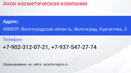 Avon, косметическая компания по адресу 400059, Волгоградская область, Волгоград, Курчатова, 3 в дальнейшем Организация, размещена в следующих категориях: