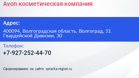 Avon, косметическая компания по адресу 400094, Волгоградская область, Волгоград, 51 Гвардейской Дивизии, 30 в дальнейшем Организация, размещена в следующих категориях: