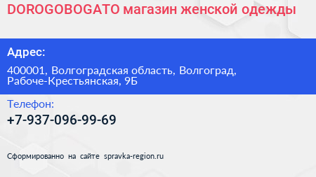 DOROGOBOGATO, магазин женской одежды по адресу 400001, Волгоградская область, Волгоград, Рабоче-Крестьянская, 9Б в дальнейшем Организация, размещена в следующих категориях: