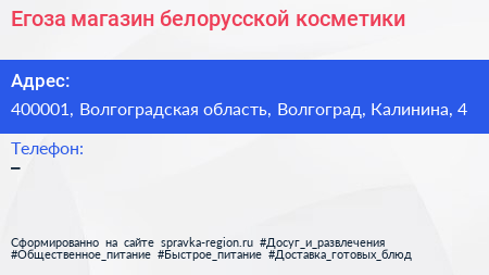Егоза, магазин белорусской косметики по адресу 400001, Волгоградская область, Волгоград, Калинина, 4 в дальнейшем Организация, размещена в следующих категориях: