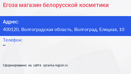 Егоза, магазин белорусской косметики по адресу 400120, Волгоградская область, Волгоград, Елецкая, 10 в дальнейшем Организация, размещена в следующих категориях:
