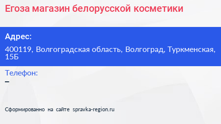 Егоза, магазин белорусской косметики по адресу 400119, Волгоградская область, Волгоград, Туркменская, 15Б в дальнейшем Организация, размещена в следующих категориях: