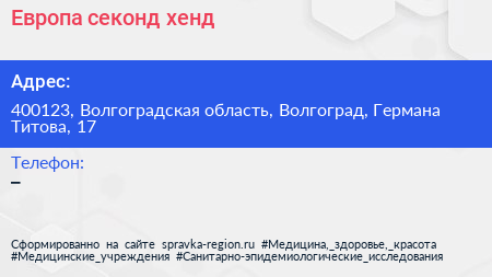 Европа, секонд-хенд по адресу 400123, Волгоградская область, Волгоград, Германа Титова, 17 в дальнейшем Организация, размещена в следующих категориях: