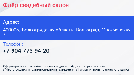 Флёр, свадебный салон по адресу 400006, Волгоградская область, Волгоград, Ополченская, 7 в дальнейшем Организация, размещена в следующих категориях: