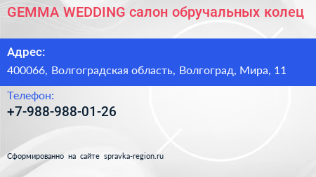 GEMMA-WEDDING, салон обручальных колец по адресу 400066, Волгоградская область, Волгоград, Мира, 11 в дальнейшем Организация, размещена в следующих категориях: