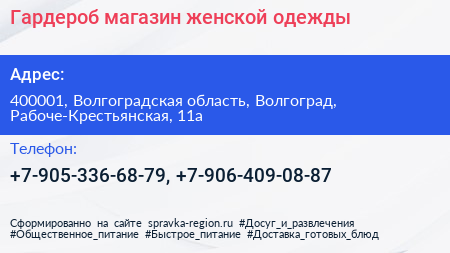 Гардероб, магазин женской одежды по адресу 400001, Волгоградская область, Волгоград, Рабоче-Крестьянская, 11а в дальнейшем Организация, размещена в следующих категориях: