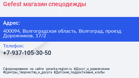 Gefest, магазин спецодежды по адресу 400094, Волгоградская область, Волгоград, проезд Дорожников, 17/2 в дальнейшем Организация, размещена в следующих категориях: