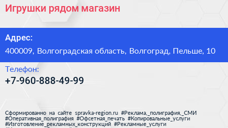 Игрушки рядом, магазин по адресу 400009, Волгоградская область, Волгоград, Пельше, 10 в дальнейшем Организация, размещена в следующих категориях: