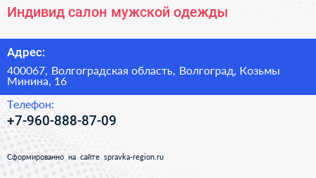 Индивид, салон мужской одежды по адресу 400067, Волгоградская область, Волгоград, Козьмы Минина, 16 в дальнейшем Организация, размещена в следующих категориях: