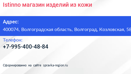 Istinno, магазин изделий из кожи по адресу 400074, Волгоградская область, Волгоград, Козловская, 58 в дальнейшем Организация, размещена в следующих категориях: