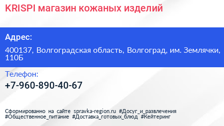 KRISPI, магазин кожаных изделий по адресу 400137, Волгоградская область, Волгоград, им. Землячки, 110Б в дальнейшем Организация, размещена в следующих категориях: