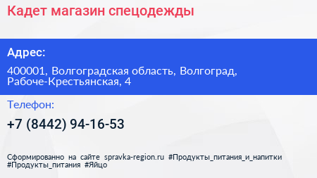 Кадет, магазин спецодежды по адресу 400001, Волгоградская область, Волгоград, Рабоче-Крестьянская, 4 в дальнейшем Организация, размещена в следующих категориях: