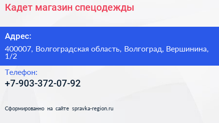 Кадет, магазин спецодежды по адресу 400007, Волгоградская область, Волгоград, Вершинина, 1/2 в дальнейшем Организация, размещена в следующих категориях: