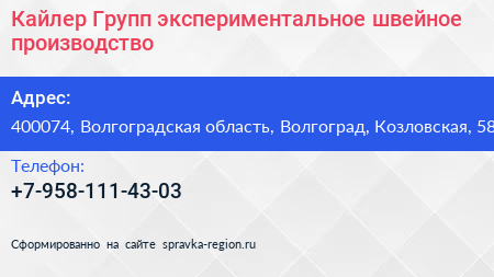 Кайлер Групп, экспериментальное швейное производство по адресу 400074, Волгоградская область, Волгоград, Козловская, 58 в дальнейшем Организация, размещена в следующих категориях: