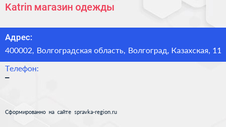 Katrin, магазин одежды по адресу 400002, Волгоградская область, Волгоград, Казахская, 11 в дальнейшем Организация, размещена в следующих категориях: