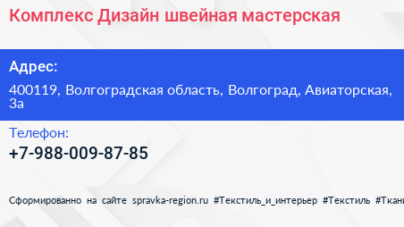 Комплекс Дизайн, швейная мастерская по адресу 400119, Волгоградская область, Волгоград, Авиаторская, 3а в дальнейшем Организация, размещена в следующих категориях:
