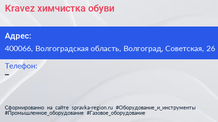 Kravez, химчистка обуви по адресу 400066, Волгоградская область, Волгоград, Советская, 26 в дальнейшем Организация, размещена в следующих категориях: