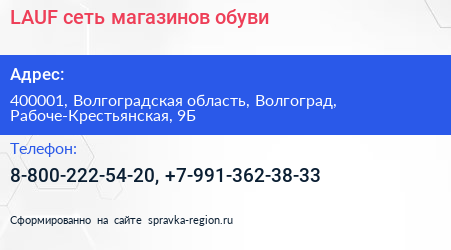LAUF!, сеть магазинов обуви по адресу 400001, Волгоградская область, Волгоград, Рабоче-Крестьянская, 9Б в дальнейшем Организация, размещена в следующих категориях: