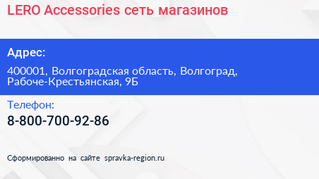 LERO Accessories, сеть магазинов по адресу 400001, Волгоградская область, Волгоград, Рабоче-Крестьянская, 9Б в дальнейшем Организация, размещена в следующих категориях:
