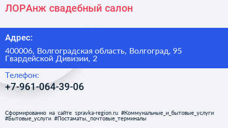 ЛОРАнж, свадебный салон по адресу 400006, Волгоградская область, Волгоград, 95 Гвардейской Дивизии, 2 в дальнейшем Организация, размещена в следующих категориях: