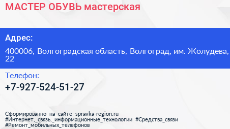 МАСТЕР ОБУВЬ, мастерская по адресу 400006, Волгоградская область, Волгоград, им. Жолудева, 22 в дальнейшем Организация, размещена в следующих категориях:
