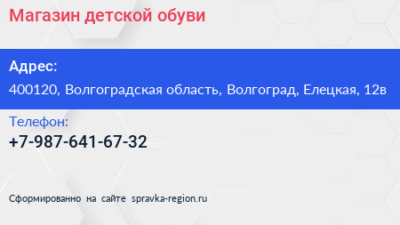 Магазин детской обуви по адресу 400120, Волгоградская область, Волгоград, Елецкая, 12в в дальнейшем Организация, размещена в следующих категориях: