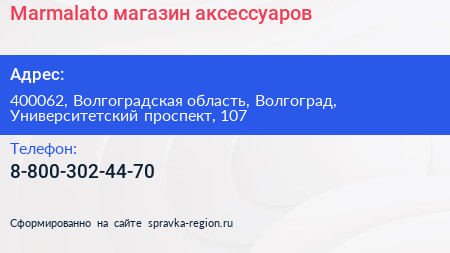 Marmalato, магазин аксессуаров по адресу 400062, Волгоградская область, Волгоград, Университетский проспект, 107 в дальнейшем Организация, размещена в следующих категориях: