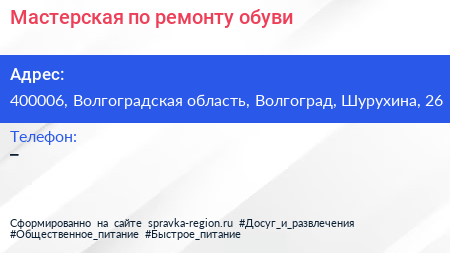 Мастерская по ремонту обуви по адресу 400006, Волгоградская область, Волгоград, Шурухина, 26 в дальнейшем Организация, размещена в следующих категориях: