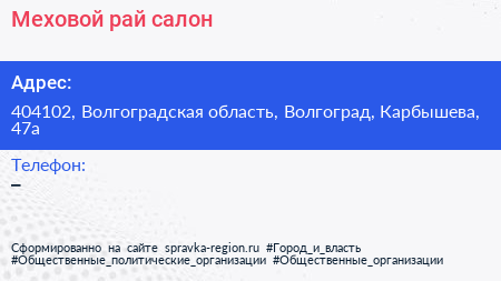 Меховой рай, салон по адресу 404102, Волгоградская область, Волгоград, Карбышева, 47а в дальнейшем Организация, размещена в следующих категориях: