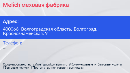 Melich, меховая фабрика по адресу 400066, Волгоградская область, Волгоград, Краснознаменская, 9 в дальнейшем Организация, размещена в следующих категориях: