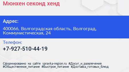 Мюнхен, секонд-хенд по адресу 400066, Волгоградская область, Волгоград, Коммунистическая, 24 в дальнейшем Организация, размещена в следующих категориях: