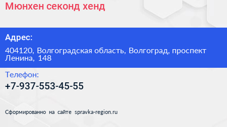 Мюнхен, секонд-хенд по адресу 404120, Волгоградская область, Волгоград, проспект Ленина, 148 в дальнейшем Организация, размещена в следующих категориях: