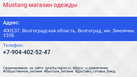Mustang, магазин одежды по адресу 400137, Волгоградская область, Волгоград, им. Землячки, 110Б в дальнейшем Организация, размещена в следующих категориях: