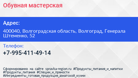 Обувная мастерская по адресу 400040, Волгоградская область, Волгоград, Генерала Штеменко, 52 в дальнейшем Организация, размещена в следующих категориях: