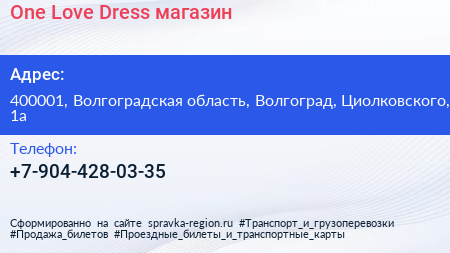 One Love Dress, магазин по адресу 400001, Волгоградская область, Волгоград, Циолковского, 1а в дальнейшем Организация, размещена в следующих категориях: