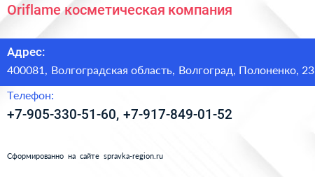 Oriflame, косметическая компания по адресу 400081, Волгоградская область, Волгоград, Полоненко, 23 в дальнейшем Организация, размещена в следующих категориях: