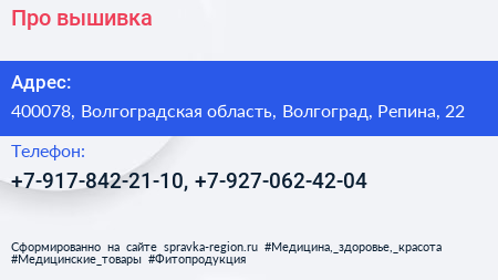 Про-вышивка по адресу 400078, Волгоградская область, Волгоград, Репина, 22 в дальнейшем Организация, размещена в следующих категориях:
