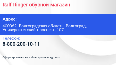 Ralf Ringer, обувной магазин по адресу 400062, Волгоградская область, Волгоград, Университетский проспект, 107 в дальнейшем Организация, размещена в следующих категориях: