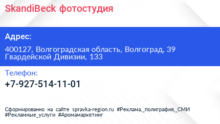 SkandiBeck, фотостудия по адресу 400127, Волгоградская область, Волгоград, 39 Гвардейской Дивизии, 133 в дальнейшем Организация, размещена в следующих категориях: