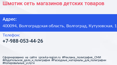 Шмотик, сеть магазинов детских товаров по адресу 400094, Волгоградская область, Волгоград, Кутузовская, 1 в дальнейшем Организация, размещена в следующих категориях: