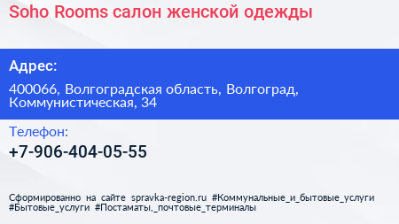 Soho Rooms, салон женской одежды по адресу 400066, Волгоградская область, Волгоград, Коммунистическая, 34 в дальнейшем Организация, размещена в следующих категориях:
